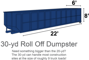 If you are concerned that a 20 yard dumpster is not enough space for your remodeling project or demolition job, the 30 yard dumpster is the rental for you! Capable of about nine full size pickup truck loads of construction waste, the 30 yard dumpster is one of the best value dumpster rentals there is. If you are about to begin a full home remodel, new construction of a home, or any other large construction project, a 30 yard dumpster is exactly what you need!